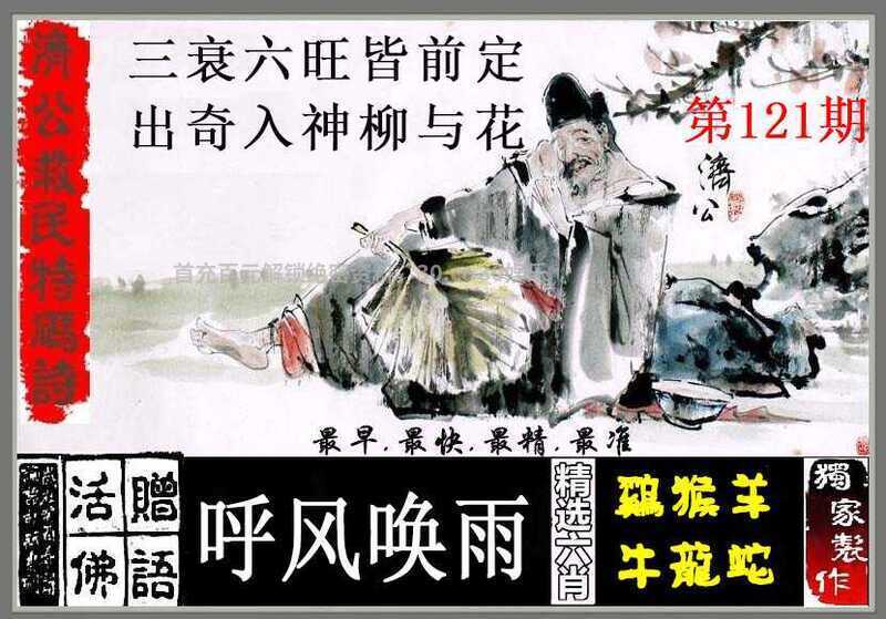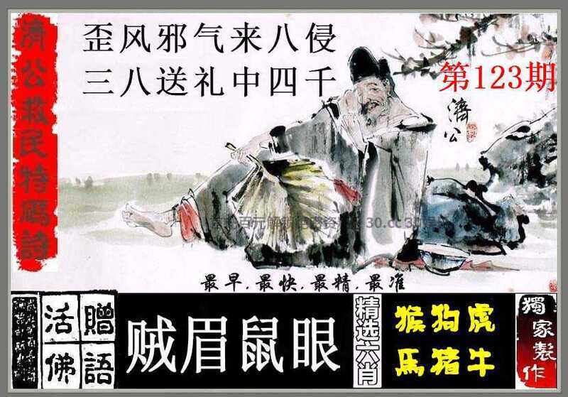 123期:济公特码诗:歪风邪气来八侵,三八送礼中四千(开:羊23)解:歪风邪气来八侵,三八送礼中四千,解肖猴狗虎马猪牛 九肖:羊狗虎龙马鸡牛鼠兔 六肖:羊狗虎龙马鸡 三肖:羊狗虎